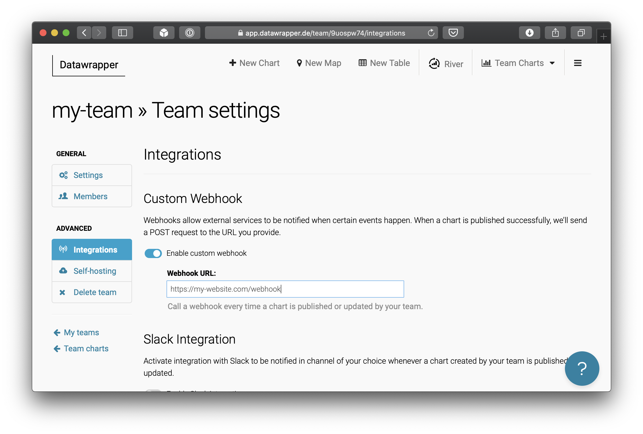 Webhooks are a really useful way to integrate Datawrapper with other services. Datawrapper allows for the configuration of webhook urls that get notified whenever a chart in your team is published or unpublished. This makes it possible to perform actions automatically based on these events. E.g to send messages to your messaging service or trigger other actions when a chart was published, like downloading a PNG of it.